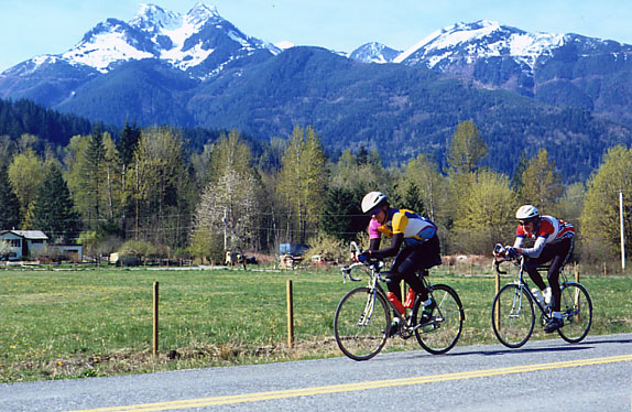Merlin not having enough steel to trigger the switching I thought Ted had settled into a nice tempo but Keith obviously decided that a sub-anaerobic pace was for wussies and he quickly surged to the front and heaped another 2 kph onto our plates - thanks bro. I wish my account of the first 60 or so km could be spruced up with lots of colourful details about the scenery etc. But, well, I didn't see any scenery. I saw Keith's bum, Ted's bum, a little bit of open road. Some times I saw Ted's bum, Keith's bum, and then a little bit of open road. The Terminators are great guys and I'm sure they have great bums, if you are into that sort of thing, but I'm a little old fashioned and I prefer babbling brooks and golden wheat fields. Now I'm sure there are bushels of babbling brooks and acres of golden wheat fields in the Fraser Valley ( I know there are, I get those bank calendars every year) but dammit I never saw 'em. One of the really nice things about randonneuring is all the wonderful chichi dining spots you encounter... like, for instance, the Petro Canada in Abbotsford. Their menu offers an exquisite selection of candy bars and potato chips and their wine list is to die for. I recommend the '94 Chateau Gatorade Lemon Lime. A saucy little vintage, perhaps a touch impudent but pleasing nonetheless. While I sampled this delightful cuisine, the Twins ate their bag lunches. Heh, this ain't no disco, this ain't no fooling around! Four minutes of respite and back on the hogs. Along South Parallel we flew with Snowbird precision. Hunkered down over our aero-bars we presented a minimum profile to the wind. My on board computer read in the low 40's for great chunks of road. This was indeed Big Ring heaven and it would last for ever, dammit! Nothing was going to stop us now! We weren't going to stop until we ran out of land! Well, at least until we reached Hell's Gate. We docked the rocket in Hope five minutes before the control opened. Would this be a time to share some of the morning's memorable moments? Would I be able to use these extra seconds to bond with the Twins? Ha ha ha! You're one funny guy Mr. Small Ring! Boom! Put your foot down! Boom! Get bottle filled! Boom! Go to washroom! Boom! Get card signed! Boom! Swing leg back over bike! Bye Bye Hope. On the big climb out of town the unthinkable happened I got shelled out the back. Spat out. Discarded. The twins scampered up the hill and I discovered that my mighty pistons had been filled with porridge. ( Hello Mr. Small Ring! I wondered where you'd been...). Amazingly, all was not lost. In a rare moment of sentiment the Twins eased back at the top and I managed to rejoin them. I wasn't entirely sure if this was a blessing or a cruel attempt at Terminator humour. Regardless, there I was - back with the lads and blasting along again. The trip to Hell's Gate was uneventful, if climbing a hill with your tongue scraping the front tyre can be called uneventful. We paused at the turnaround for more Boom! Boom! and we were off again. The descent proved to be easier than the climb up - it's funny how that works isn't it? After a while we started running into our pedalling colleagues. First Peter Stary and Phil Minter cruised by. Anna Bonga and company followed along shortly. Mike Hagen came into view and disappeared quickly (as brevet organiser he had started his ride one hour later and missed the bonding experience with the Twins.....poor guy). Shortly before descending the hill back into Hope we ran across Harold Bridge. Why is he always so dammed cheerful? Mr. Big Ring hates that! By the time we reached the Seabird Island Cafe, the Gods decided enough was enough. Bath time, Mr. Big Ring. Little sprinkles turned into large sprinkles. Large sprinkles turned into a torrential downpour. I admit it, I got wet. And yet, things were not all bad. Because we had ourselves a tail wind. Whoo Eee! We gonna fly, down into that easy chair. All along the sodden Lougheed we sped. Bridge requests 40 kms per hour? No problem Scotty, the engines can handle it. Up over the Maryhill Bypass (and lemme tell you, it was raining so hard even Mary had gone home) and back into town rode the rocket When we arrived at that excellent little Scottish restaurant at Boundary and Broadway the time chimed 12:39. Okay, it didn't actually chime, but it should have. 12:39! Yes! An average of 3:10 per 100km or two 6:20 200s back to back. (Hmm, did we miss a 50km section because of the rain guys?). Mr. Big Ring was happy. Mr. Big Ring tried to show he wasn't happy but, oops, the mask slipped. Oh oh, it's Mr. Small Ring under there after all! Bad Mr. Small Ring - you don't belong in the Terminator Club! Postscript: Mr. Small Ring showed up for the 600, determined to ride with the Twins. Uh uh. On a really long, brutish climb Mr. Small Ring turned into a crispy bit of toast. The Terminators don't like toast on long rides. Bye Bye Mr. Small Ring. |